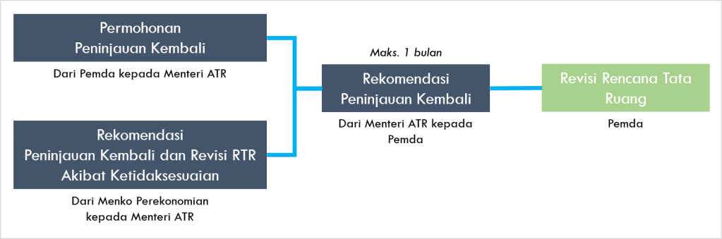 Permohonan peninjauan kembali dan revisi terhadap dokumen rencana tata ruang dapat dilakukan melalui 2 cara, yakni pengajuan permohonan peninjauan kembali oleh pemerintah daerah kepada Menteri ATR atau pengajuan rekomendasi peninjauan kembali dan revisi rencana tata ruang akibat ketidaksesuaian yang diajukan oleh Menko Perekonomian kepada Menteri ATR. Adapun Menko Perekonomian dapat menetapkan rekomendasi sesuai ketentuan peraturan perundang-undangan apabila terjadi ketidaksesuaian antara rencana tata ruang dengan batas daerah, dengan kawasan hutan, atau ketidaksesuaian RTRW Provinsi dengan RTRW Kabupaten/Kota. Revisi rencana tata ruang yang dilakukan, dilaksanakan dengan tetap menghormati hak kepemilikan yang sesuai dengan peraturan perundang-undangan.