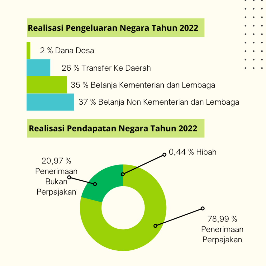 Berdasarkan Undang-Undang Republik Indonesia Nomor 28 Tahun 2022 Tentang Anggaran Pendapatan Dan Belanja Negara Tahun Anggaran 2023, direncanakan Anggaran Pendapatan Negara Tahun Anggaran 2023 direncanakan sebesar Rp2.463 triliun yang diperoleh dari: penerimaan perpajakan, PNBP, dan Penerimaan Hibah. Sedangkan, Anggaran Belanja Negara Tahun Anggaran 2023 direncanakan sebesar Rp3.061,2 triliun yang terdiri atas: anggara belanja pemerintah pusat dan anggaran TKD. Terakhir, Program Pengelolaan Subsidi dalam Tahun Anggaran 2023 direncanakan sebesar Rp298 triliun.